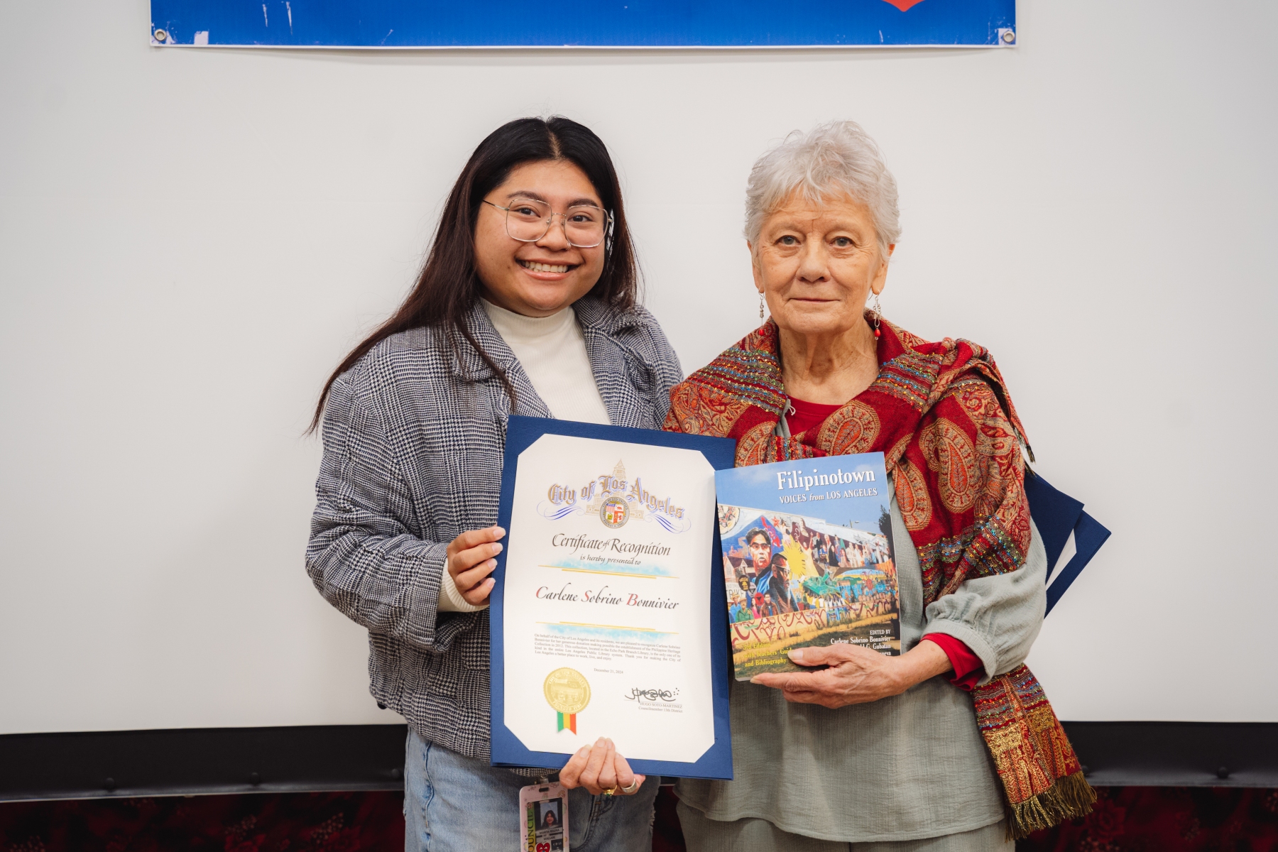 Carlene Sobrino-Bonivier(R) receiving certificate of recognition from Regina Mallare, field deputy, Council District 13 of Council Member Hugo Soto-Maritinez