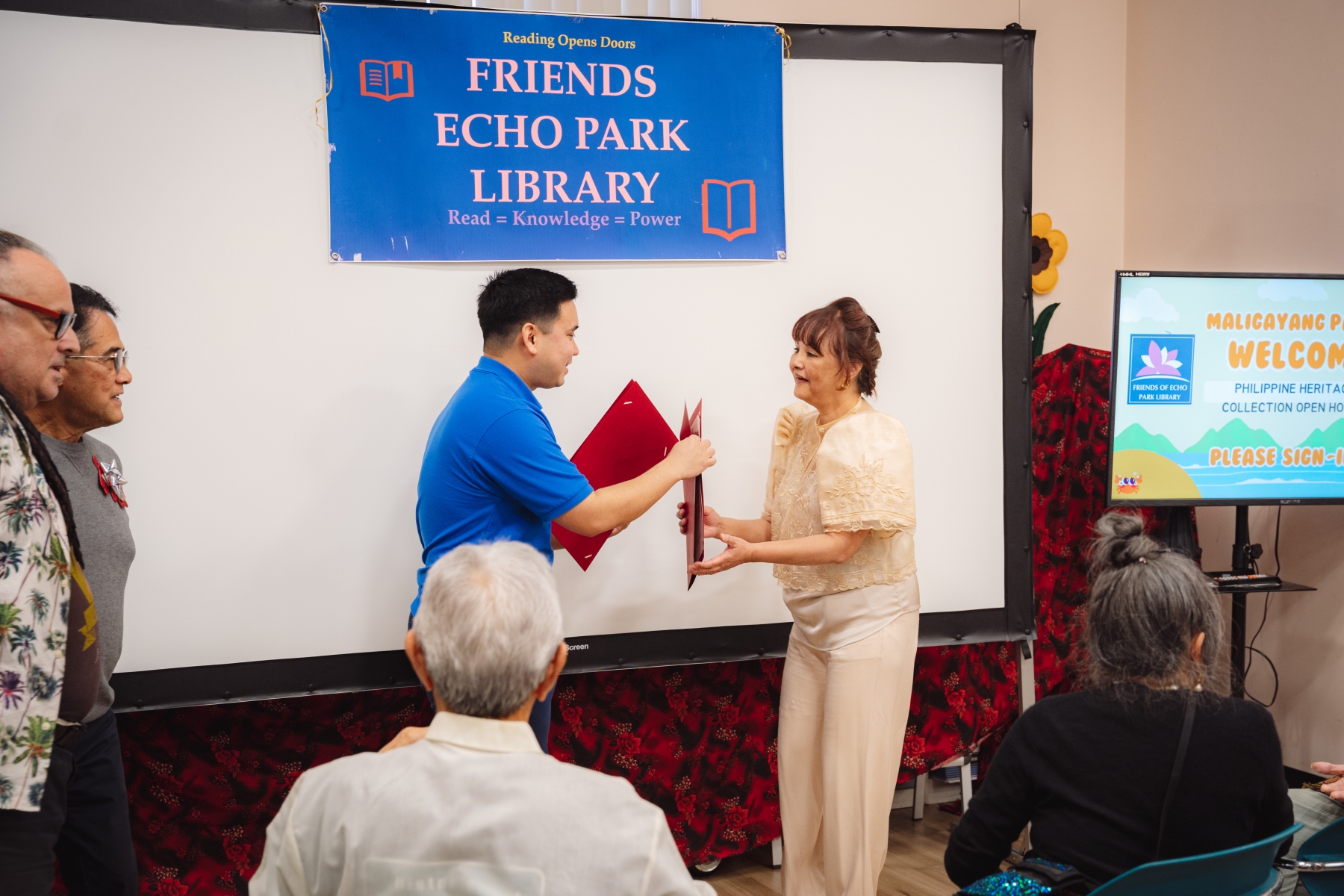 Philippine Heritage Collection (PHC) Open House Saturday December 21, 2024 at the Echo Park Library from 9:30 AM to 4:00 PM Photo-64 Image 26 of 37 Anthony Cespedes, (Deputy to LA County Supervisor Hilda Solis) presenting certificate of recognition to Marissa Banez
