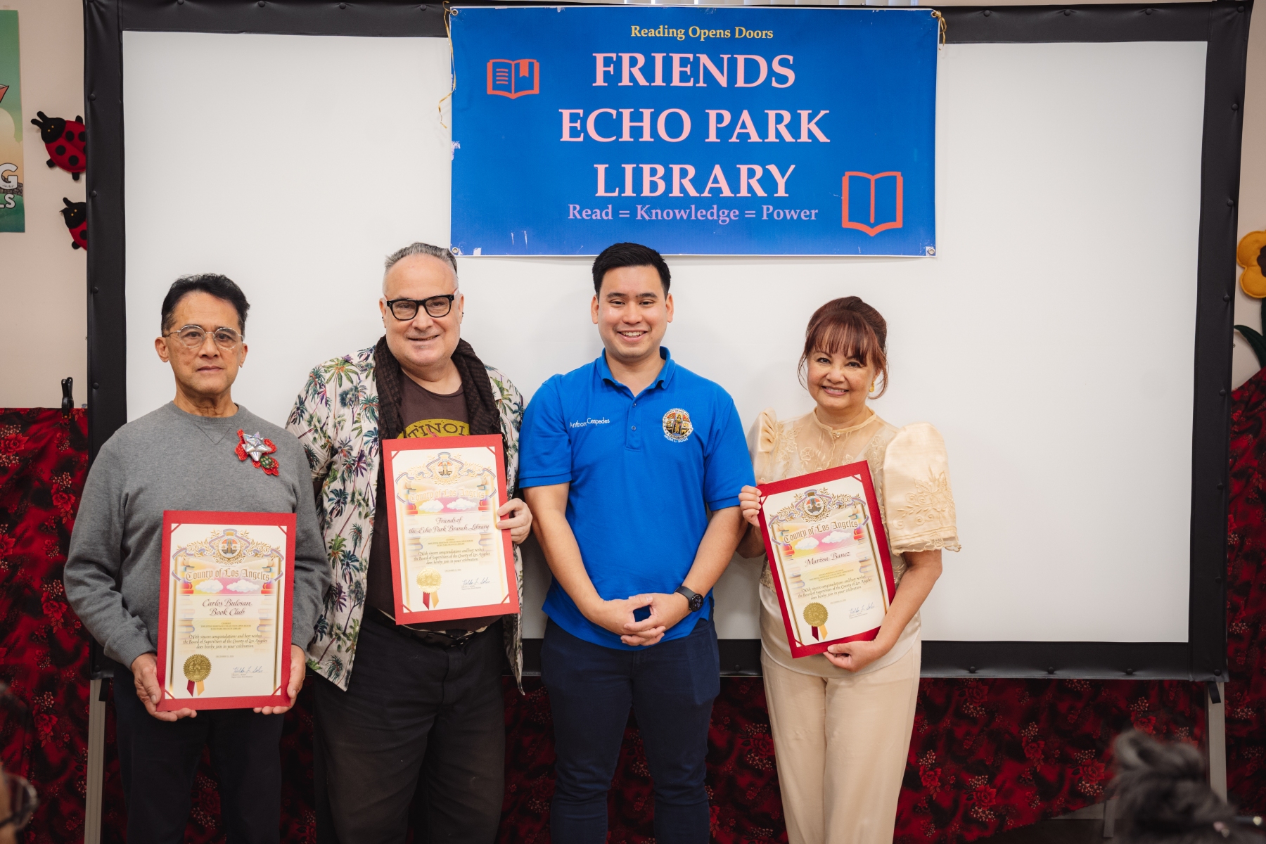 L-R: Jaime Geaga (FOEPL Board Treasurer), David Rockello (FOEPL Board President Emeritus), Anthony Cespedes, (Deputy to LA County Supervisor Hilda Solis), & Marissa Banez